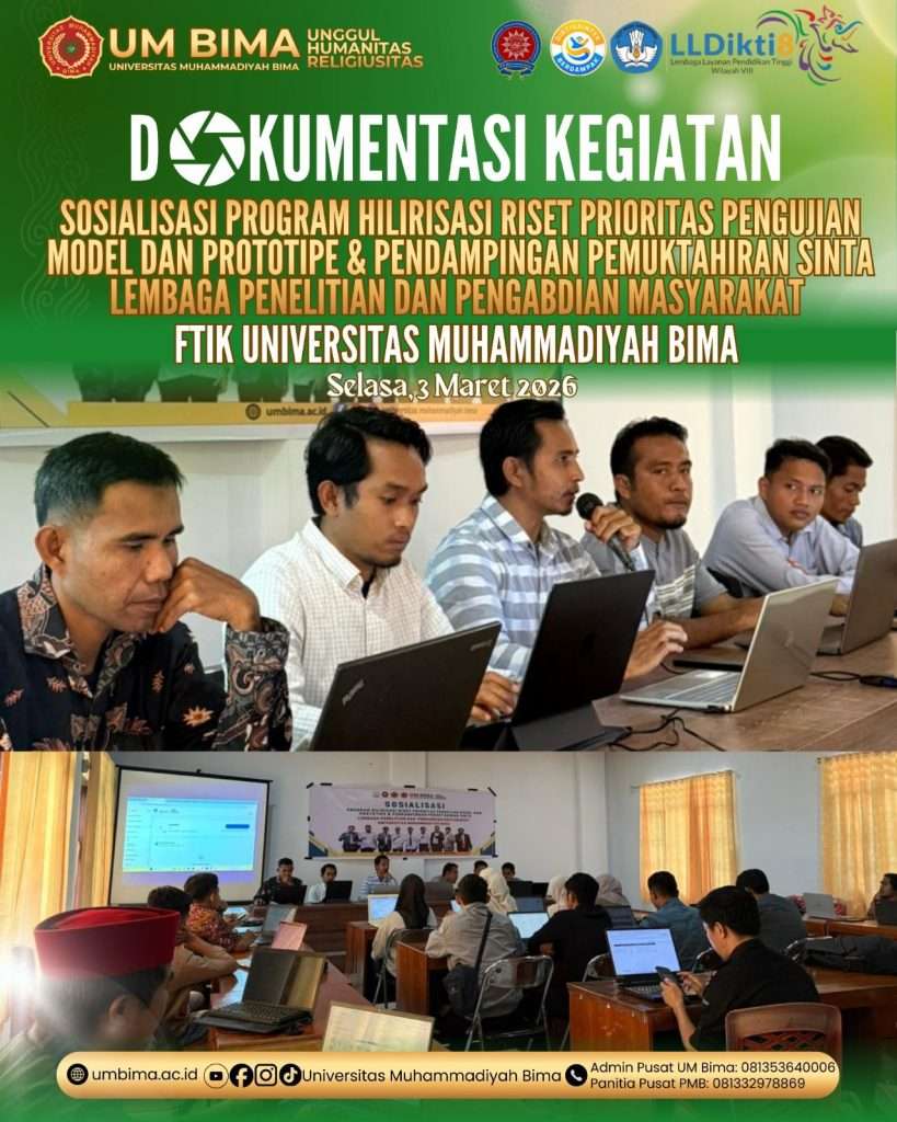 umbima.ac.id- Universitas Muhammadiyah Bima (UM Bima) melalui Fakultas Teknik dan Ilmu Komputer (FTIK) menyelenggarakan kegiatan Sosialisasi Program Hilirisasi Riset Prioritas Pengujian Model dan Prototipe serta Pendampingan Pemutakhiran SINTA pada Selasa, 3 Maret 2026. Kegiatan ini dilaksanakan di Ruang pertemuan kampus I UM Bima dan dihadiri oleh dosen serta tim Lembaga Penelitian dan Pengabdian kepada Masyarakat (LPPM).